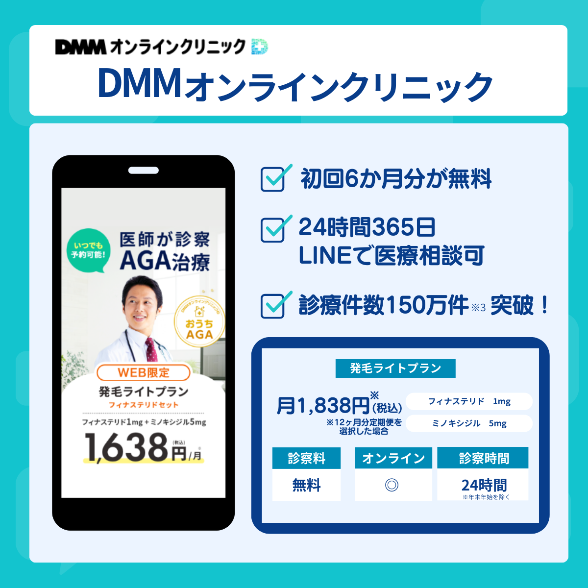 クーポン利用で初回の料金がお得になり、月額1,638円(税込)からの金額で予防も発毛も期待できる『発毛ライトプラン』が選べるDMMオンラインクリニックがおすすめです!