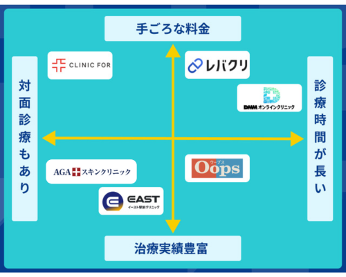 クリニック名 | ![]() DMMオンラインクリニック | ![]() レバクリ | ![]() クリニックフォア | ![]() Oops HAIR | ![]() イースト駅前 クリニック | AGAスキンクリニック |