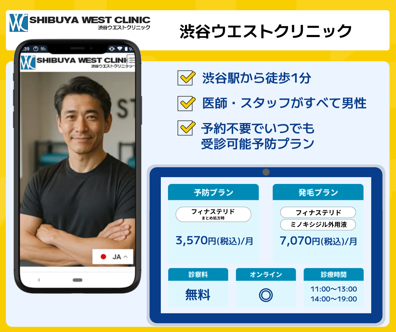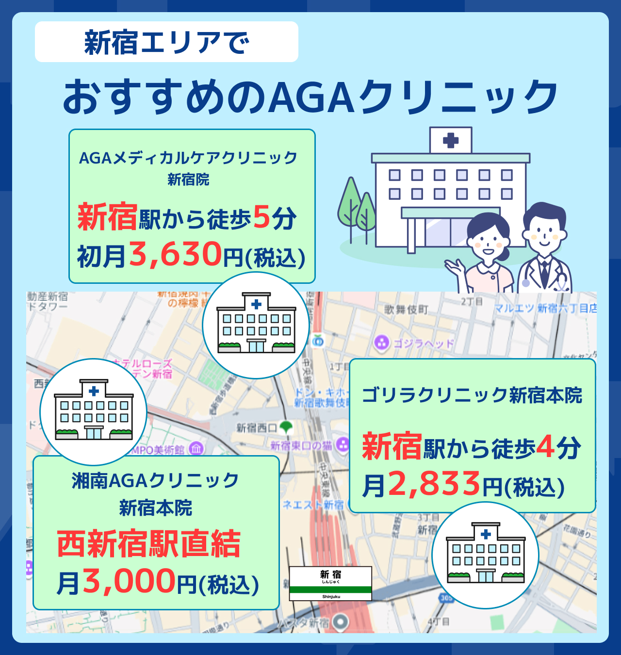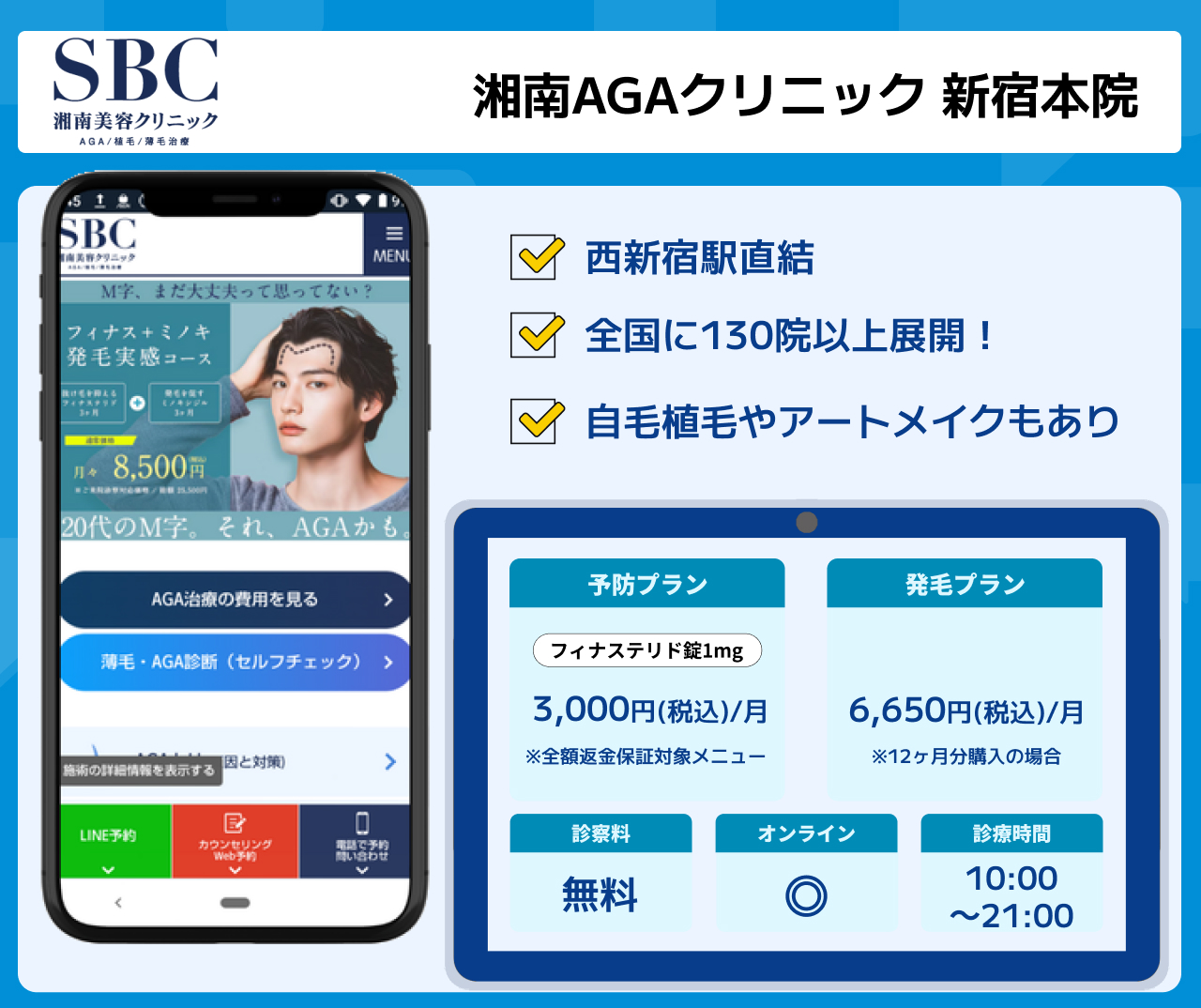新宿駅西口から徒歩2分なので、仕事帰りや昼休みなどの時間で対面診療でもAGA治療をでき受けることができます。