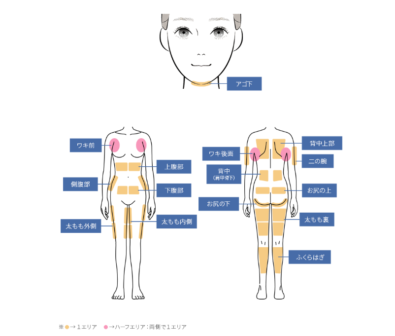アゴ下、ワキ前、上腹部、側腹部、下腹部、太もも外側、太もも内側、ひざ上、背中上部、ワキ後面、二の腕、背中(肩甲骨下)、お尻の上、お尻の下、太もも裏、ふくらはぎ、足首