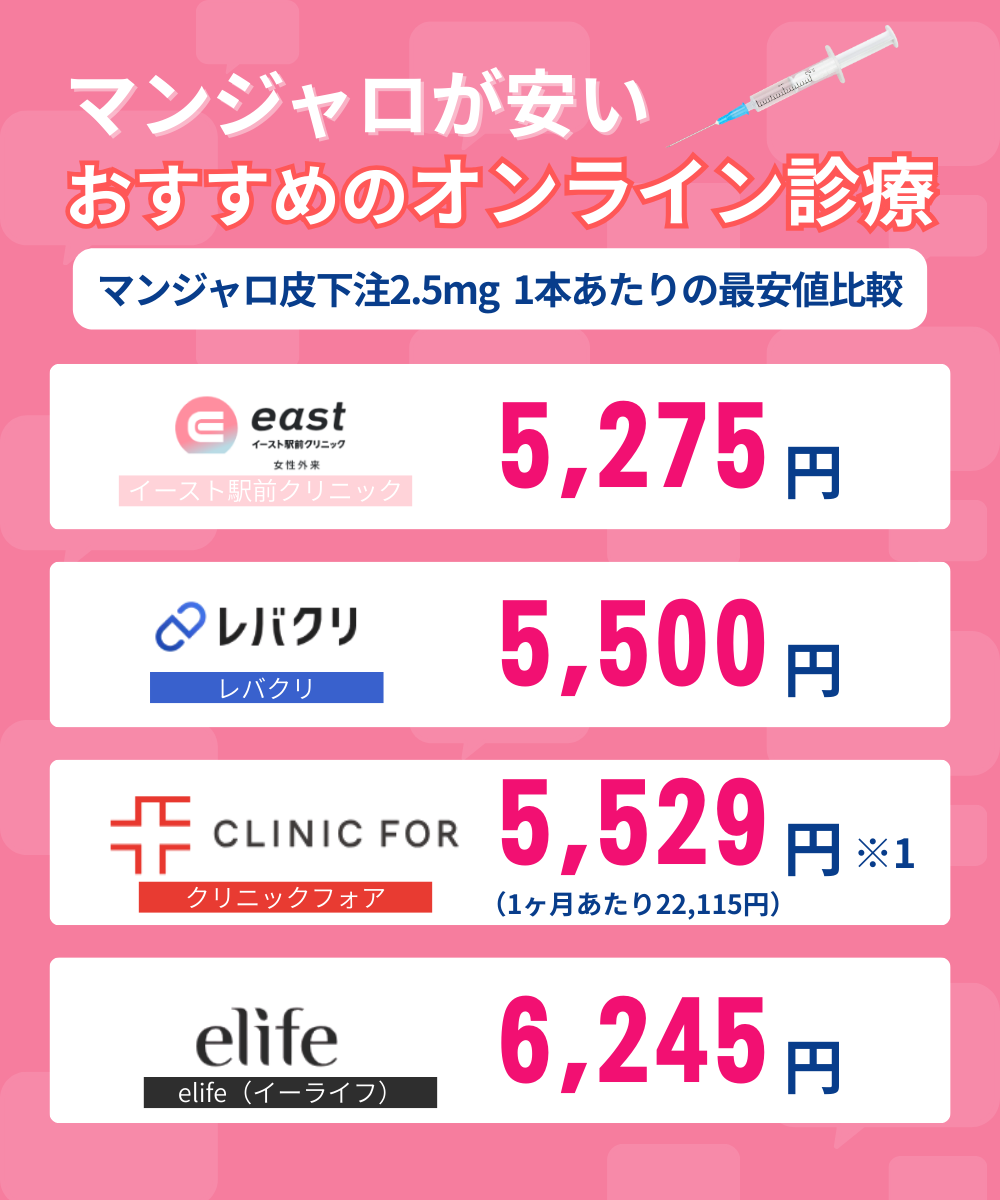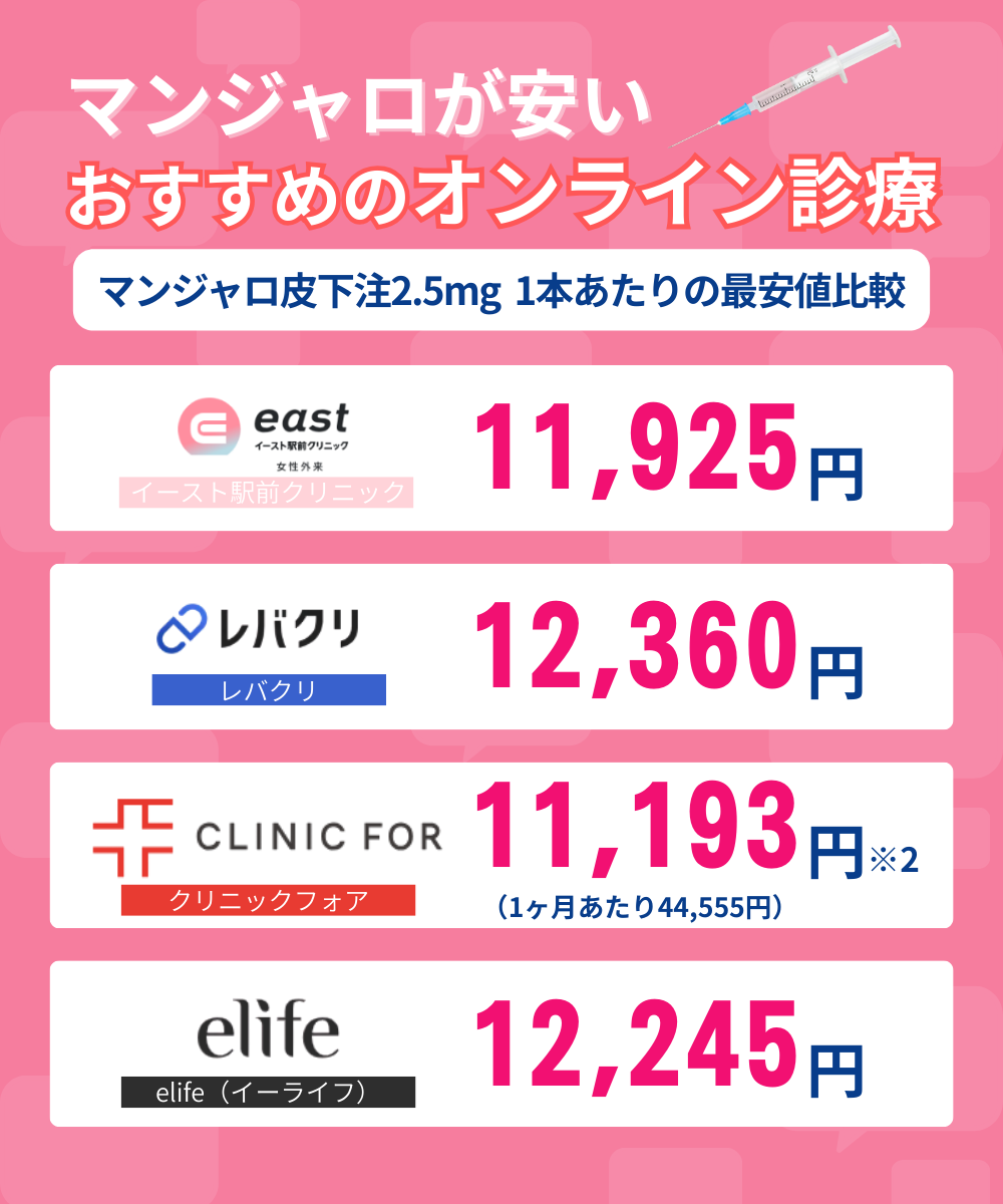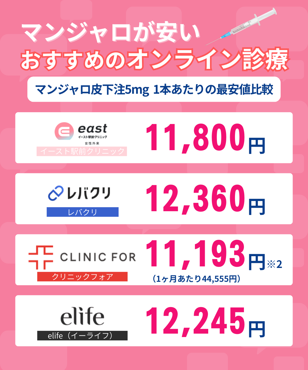 マンジャロが最安値で入手できるオンラインクリニックはイースト駅前クリニックです。