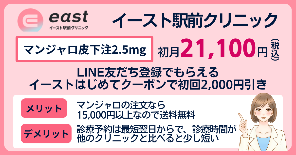毎回安くマンジャロを処方してもらいたい方には、イースト駅前クリニックがおすすめです。