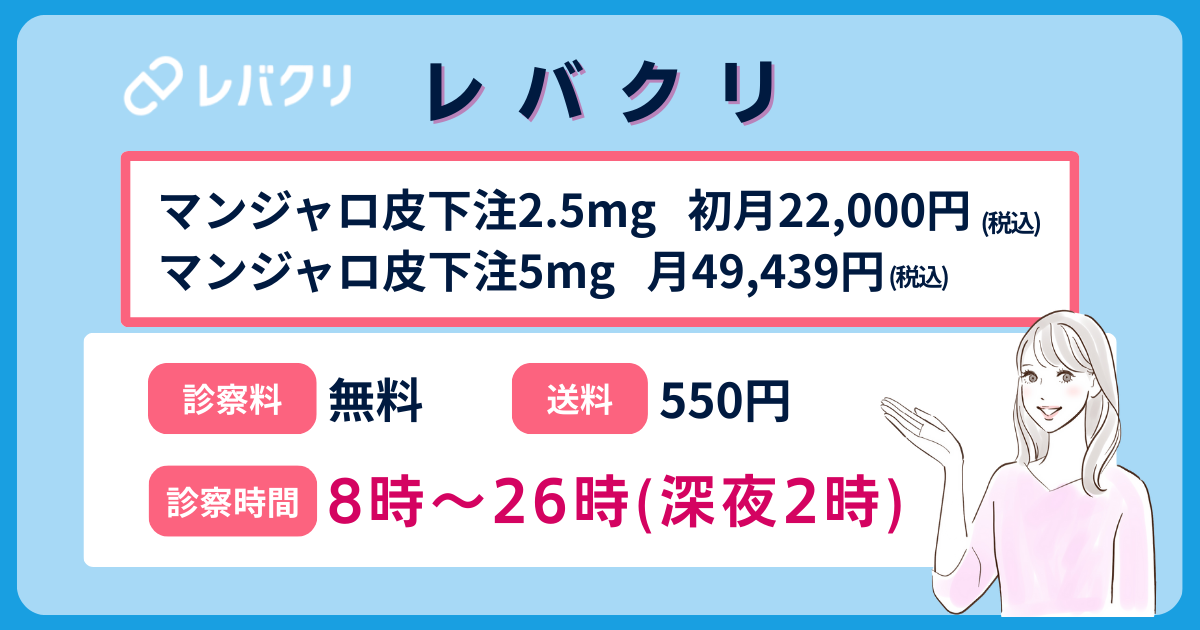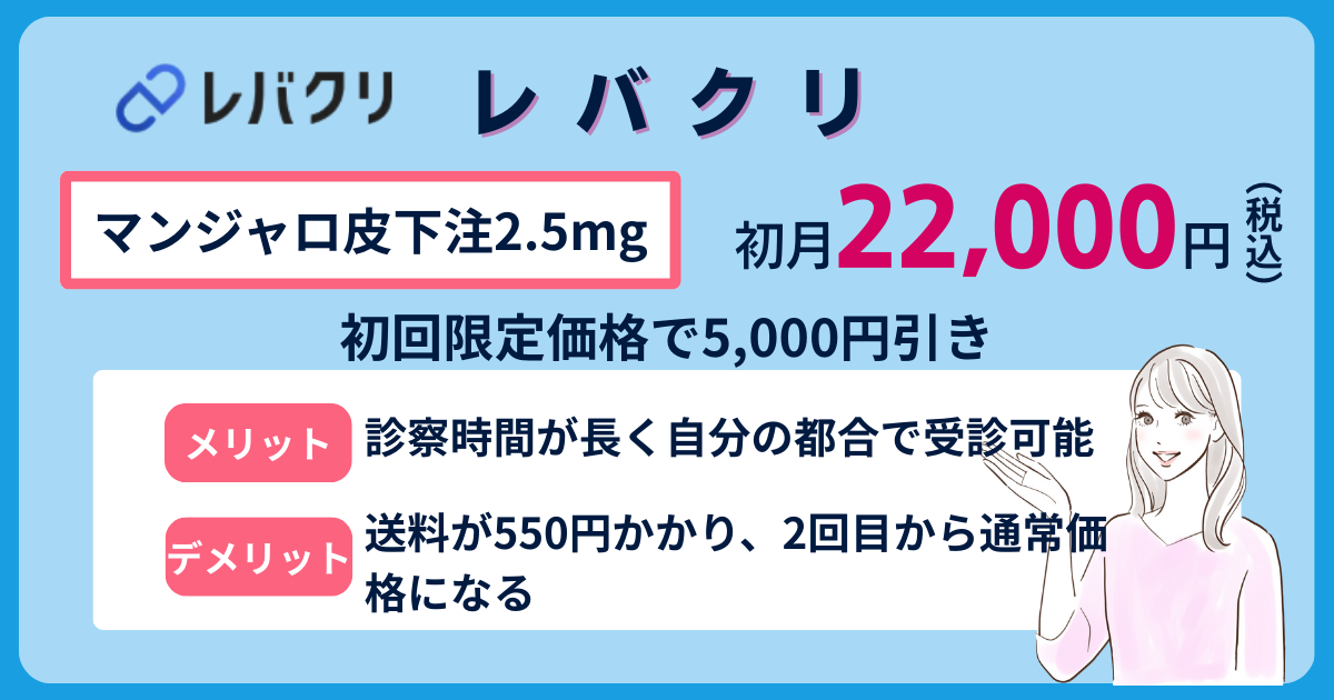 レバクリでは、マンジャロ2.5mgの1ヶ月定期便が初月22,000円(税込)で処方してもらうことができます。