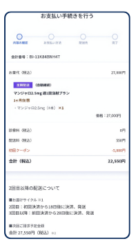 クーポンコードを利用した場合、1ヶ月分4本が22,115円(税込)※1でマンジャロ皮下注2.5mgを処方してもらえます。