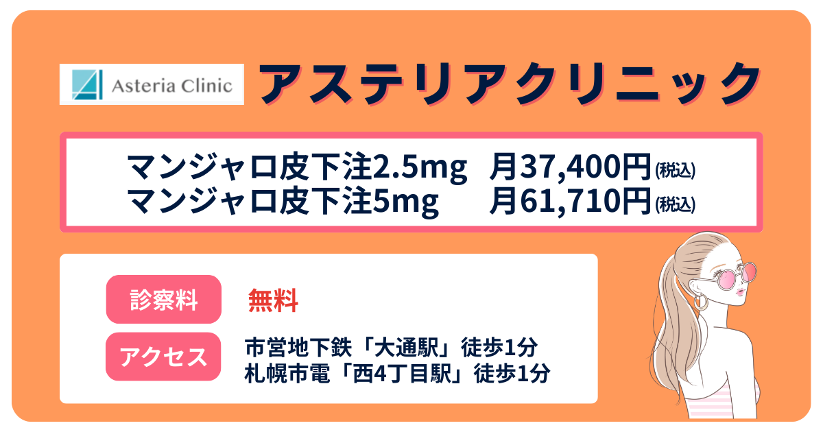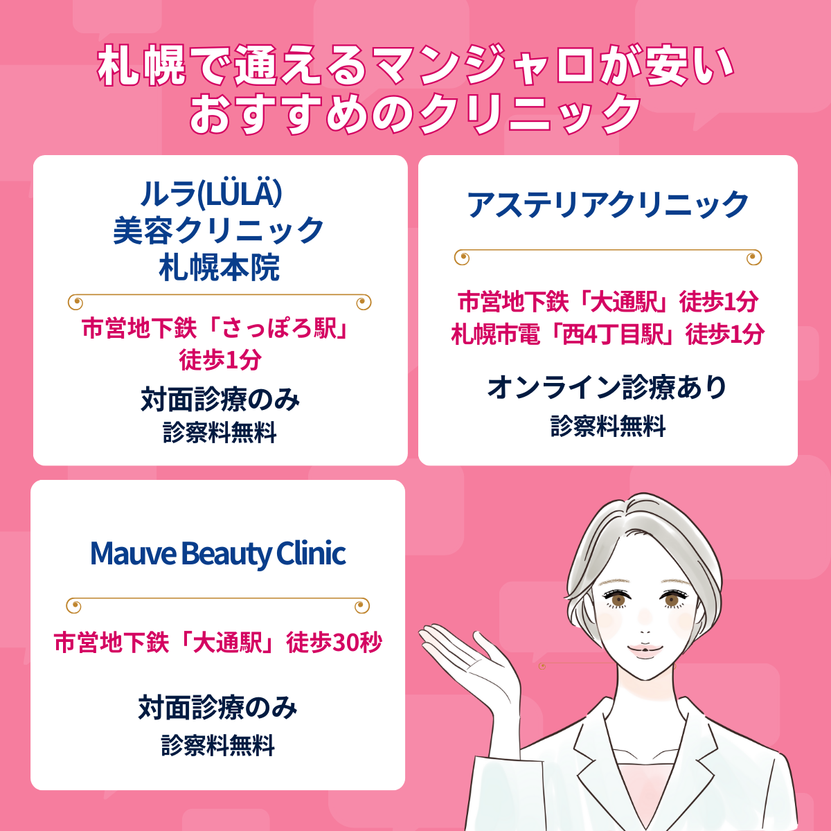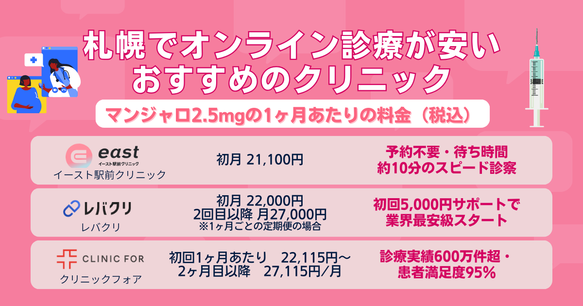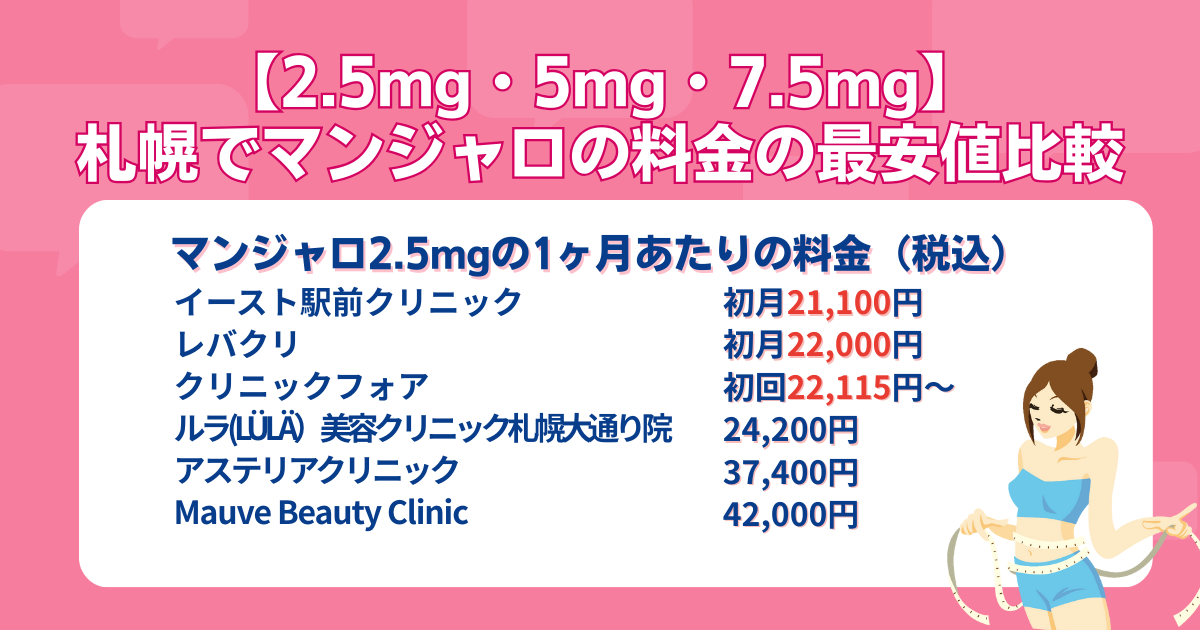 札幌でマンジャロ2.5mgを扱う主要クリニックを対象に、1か月あたりの料金目安をまとめています。