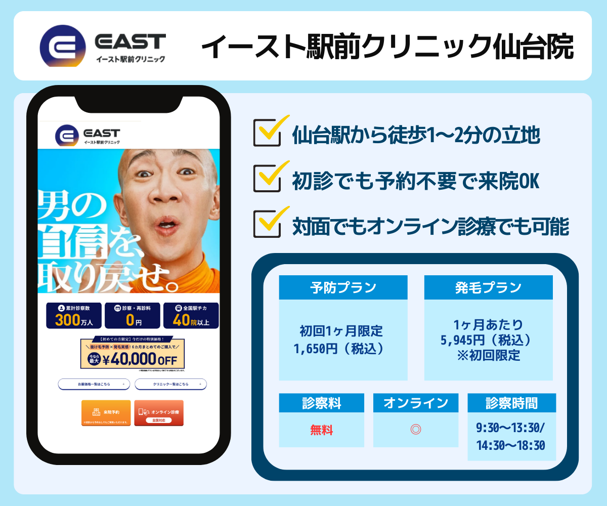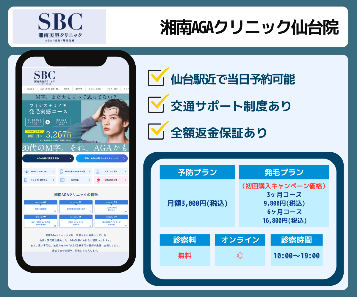 湘南AGAクリニック仙台院は、仙台駅より3分の駅近の場所にあり、当日予約もOKなので通いやすいクリニックです。