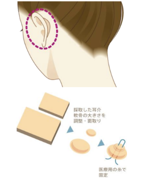 耳の後ろ(付け根部分)から耳介軟骨を採取します。軟骨の厚みは約 1mm 程度のため、仕上がりのデザインに合わせて 2~3 枚を重ね合わせて使用します。軟骨が小さすぎると点状に尖りすぎたり、逆に大きすぎると角が立ってしまったり・フラットな鼻先になったりと、仕上がりを大きく左右する部分のため、バランスを見ながら慎重に調整します。