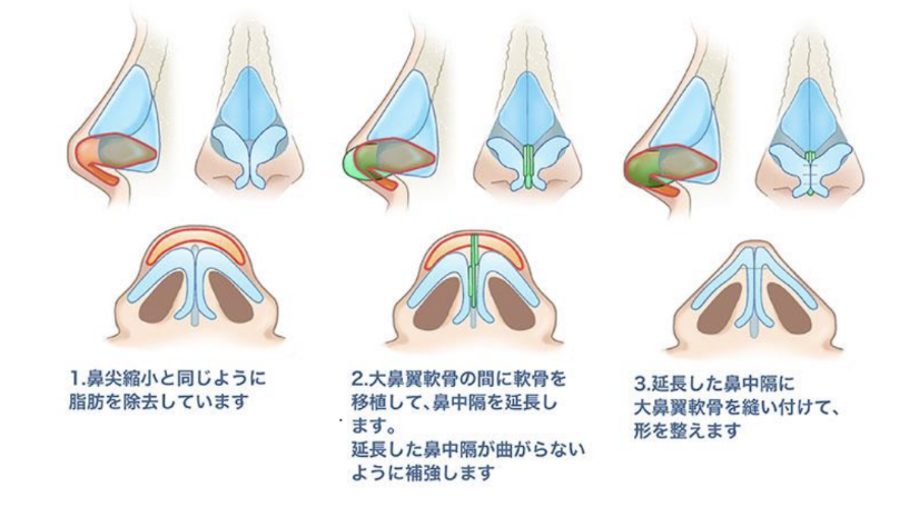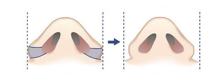 鼻の穴を切開し、鼻中隔軟骨と外側鼻軟骨の間の連結を切り離します。その後鼻中隔軟骨を切除 (軟骨部分の出っ張りはヤスリ、軟骨部分はメス刃)して平らにします。また、出っ張りが強い場合、切除すると削った部分が平坦になり、鼻筋が太く見える可能性があるため、鼻骨骨切りを併用すると相乗効果がある場合があります。
