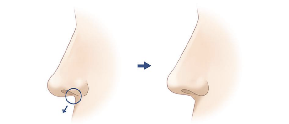 鼻柱が横から見た際に小鼻に隠れてしまっている場合、鼻が大きく丸みを帯びているような印象になってしまいます。この鼻柱を下降させることで美しい立体的な鼻のラインを作り上げることが可能となります。