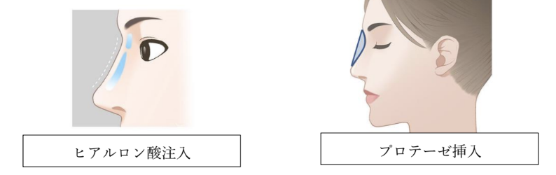 鼻を高くする方法には、ヒアルロン酸などの注入によるものと、シリコンプロテーゼによる隆鼻術があります。鼻根部から鼻背にかけて人工シリコン(プロテーゼ)を用いたり、軟骨など自家組織を用いて鼻を高くする方法などがあります。